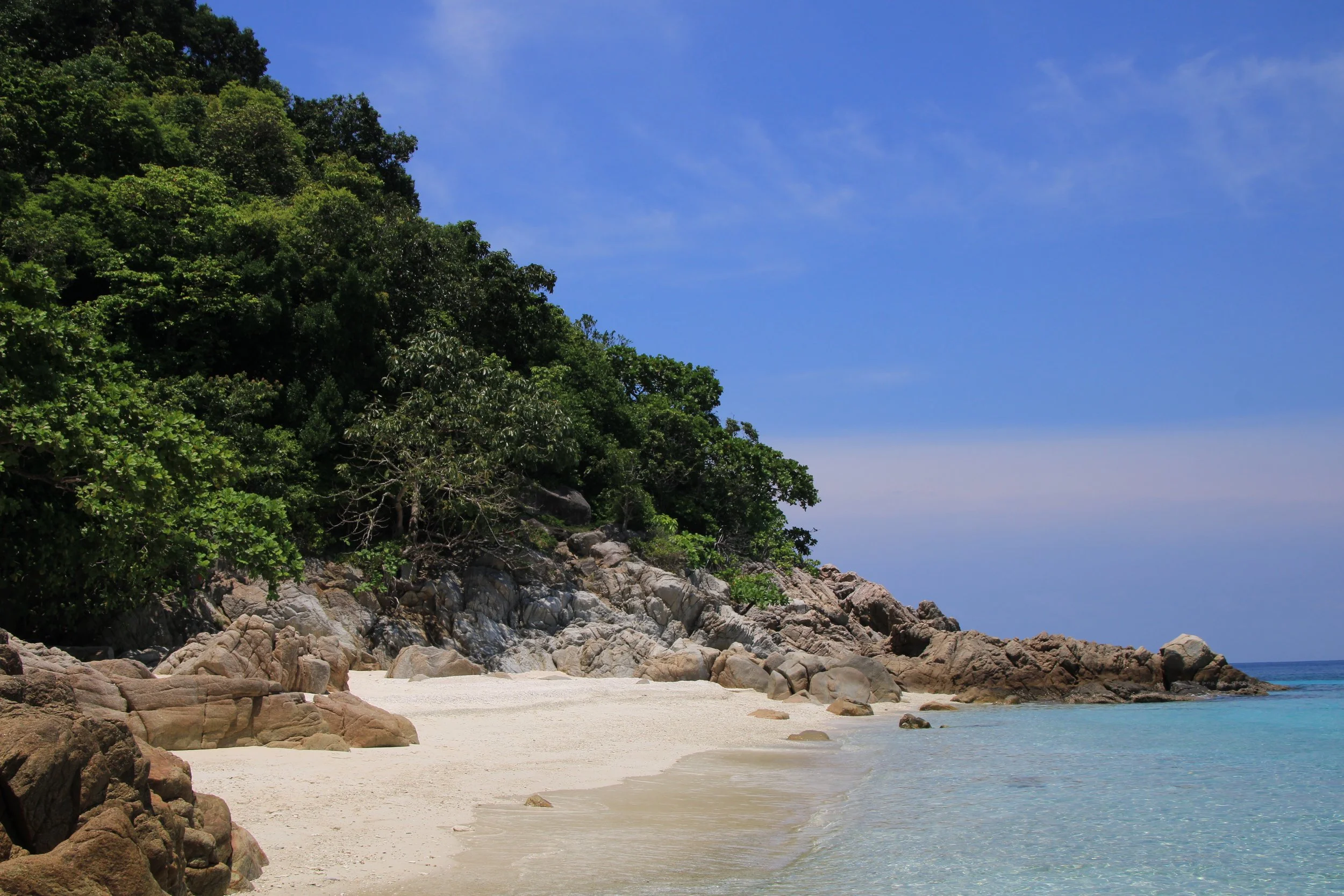Situated in the tropic of Cancer, the Perhentian Islands are made up of two inhabited islands and several uninhabited rocks, about 20 minutes by boat from the mainland. They are forested in largely pristine tropical rainforest of vines, palms, some bamboo, and ficus trees.