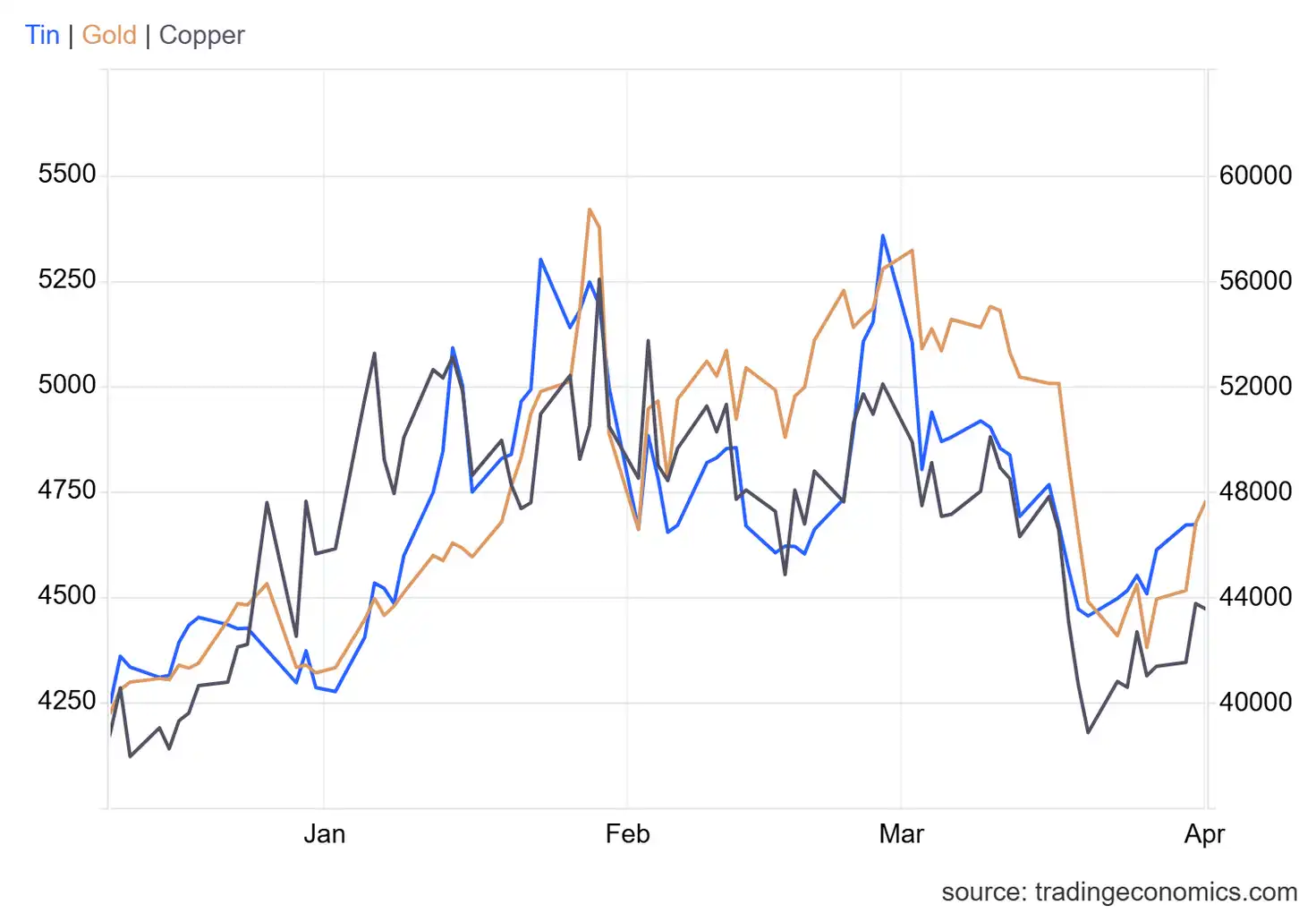 From the new year, tin prices climbed non-stop from $40,600 to $56,000 by January 19th, a 27.5% move up, and a high that it would eventually break a month later on February 23rd when it topped $57,000. Tin then followed the metals down sharply after the US and Israel launched their aggressive war against Iran.